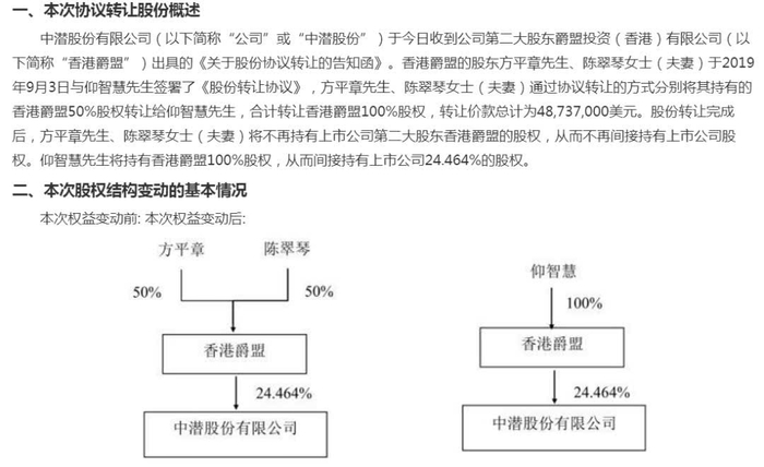 9月3日,中潜股份公告称,其第二大股东香港爵盟的股东方平章、陈翠琴夫妇以协议转让方式向仰智慧出售了香港爵盟100%股权,总价4873.7万美元(约3.5亿元人民币)。