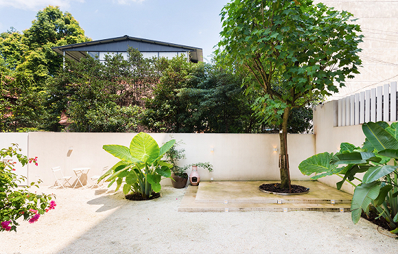 整栋别墅前后都有院子,院里的香樟、梧桐为房客们撑起了一片荫凉。350平方的面积设计了三间套房,每间套房嵌入浴室设备。