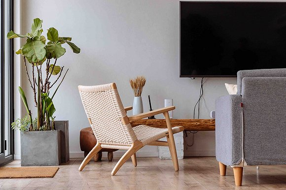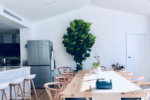 室内空间同样以纯白色为主,白色墙壁跟白色软装搭配,显得整个家非常明亮通透,再用绿色植物装点,制造出在家度假的闲适感。