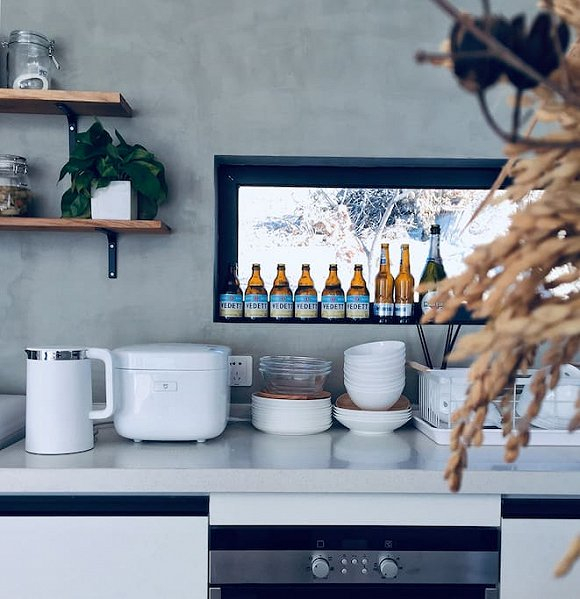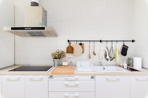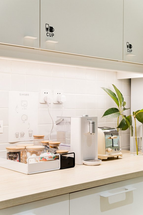 厨房设施齐全,有咖啡机、烤面包机、对流式烤箱和微波炉。房东非常细心地在每个抽屉外贴上了标签,方便大家拿取杯子、刀、勺子等厨具。