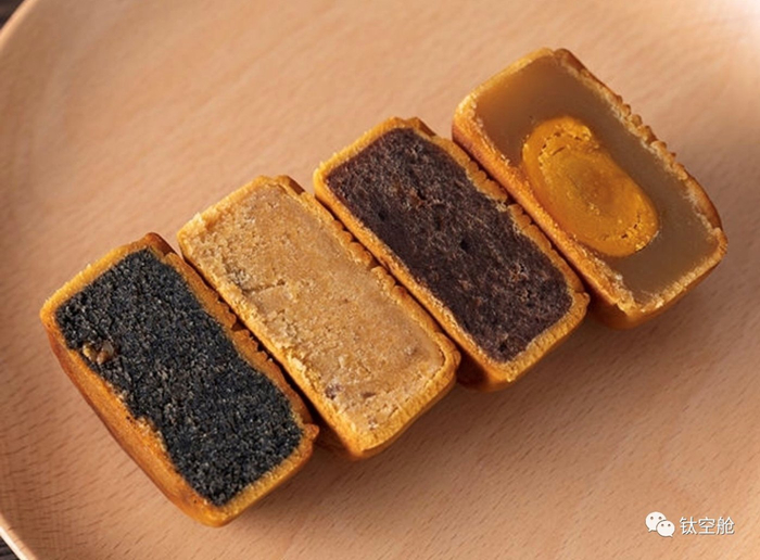 旁边分别是普通大小的:藤椒牛肉、陈皮豆沙、蛋黄莲蓉、经典黑芝麻月饼各1个。