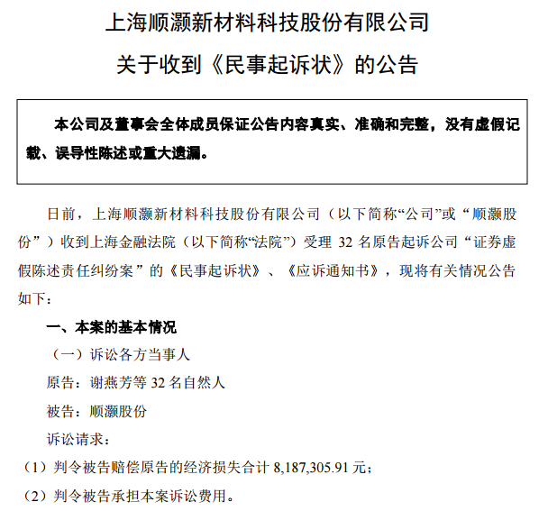 9月6日,顺灏股份发布公告称,公司日前收到上海金融法院受理46名原告起诉公司“证券虚假陈述责任纠纷案”的《民事起诉状》,46名自然人请求判令公司赔偿原告的经济损失合计504.97万元。