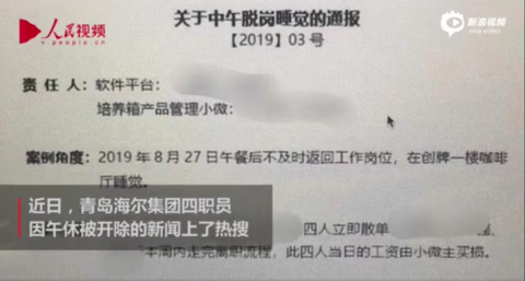 近日,海尔集团被曝出有4名员工因饭后午休,被巡查人员抓到后开除,并勒令一周内办理离职手续。该事件在网上引发质疑:企业员工是否有午休的权利?