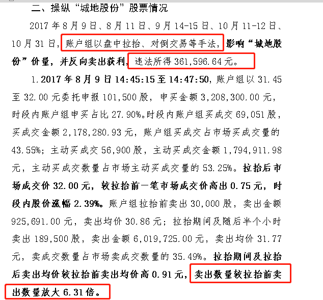 “2017年8月9日14:45:15至14:47:50,账户组以31.45至32.00元申买金额320.8万元。拉抬后市场成交价32.00元,较拉抬前一笔市场成交价高出0.75元,时段内股价涨幅2.39%。账户组拉抬前卖出30000股,卖出金额92.57万元,卖出均价30.86元;拉抬期间及随后半个小时卖出189500股,卖出金额601.97万元,卖出均价31.77元,卖成交数量占市场卖成交数量的35.49%。拉抬期间及拉抬后卖出均价较拉抬前卖出均价高0.91元,卖出数量较拉抬前卖出数量放大6.31倍。”