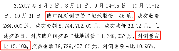 “2017年8月9日、8月11日、9月14-15日、10月11-12日、10月31日,账户组对倒交易“城地股份”46笔,成交数量264,000股,成交金额8,744,782.00元,成交均价33.12元。上述交易日,对应账户组交易“城地股份”1,748,037股,对倒量占比15.10%,交易金额79,729,457.02元,对倒金额占比10.96%。”