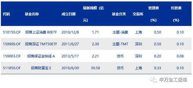 招商基金管理有限公司于2002年12月27日成立,是中国第一家中外合资基金管理公司。招商基金于2010年开始布局指数产品,目前共有21只指数基金,二季度末管理规模(不含ETF联接)总计242.03亿元,产品类型涵盖ETF、分级基金、增强指数基金、被动指数基金等。在ETF产品方面,有4只ETF:2只股票ETF以及2只货币ETF。2只股票ETF分别为招商上证消费80ETF、招商深证TMT50ETF,截止2019年8月30日,规模分别为1.71亿元、2.30亿元。