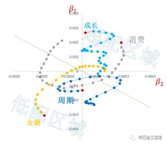 资料来源:申万宏源研究,注:以上风格划分以行业聚类得到,图中每一点代表一日数据,起点为2019年7月24日,红色为终点2019年8月30日(所有风格沿逆时针方向移动)。横轴β2为相对强弱曲线二阶导数替代指标,纵轴β1位相对强弱曲线一阶导数替代指标,黄色直线为边界线,直线右上方(越远越好)建议超配该风格,反之低配。 |