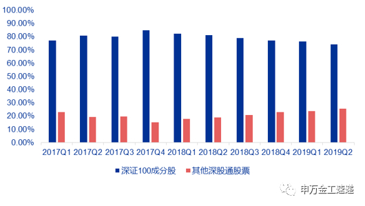 2019年5月1日起,沪股通及深股通每日额度分别上调4倍调整为520亿元人民币,极大的方便北向资金进出A股市场。由于北向资金持股情况自2017年3月份开始才开始披露,我们选择最近两年每个季度的持股数据进行跟踪,可以看到,在深股通持股结构中,深证100成分股的市值占比始终保持在74%以上,期间最高达到85%,集中度非常高。截至2019年Q2,深股通中深100指数成分股市值占比约为74.30%。