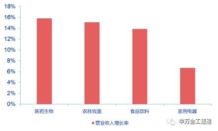 根据最新公布的上市公司2019年中报,消费板块业绩增长势头良好,医药生物、农林牧渔、食品饮料3个行业的营业收入同比增速分别达到15.82%、15.11%、13.88%,增速在28个申万行业中位居前列;家用电器行业的业绩表现同样稳定,营业收入同比增长6.67%,净利润同比增长9.43%。