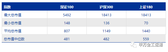 同时也可以看到,深证100指数的最大总市值、最小总市值之间差异较小,说明指数样本股间的市值分布更为均衡。