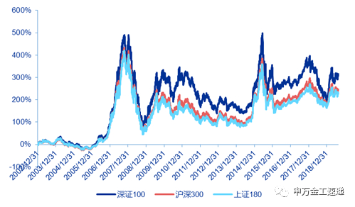 深证100指数历史走势表现较好, 2002/12/31-2019/8/30,深证100指数上涨315.39%,涨幅超越沪深300与上证180同期表现。
