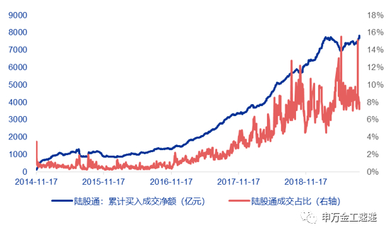图1:陆股通成交占比达到9%左右,北向资金对A股市场影响日益深入 |