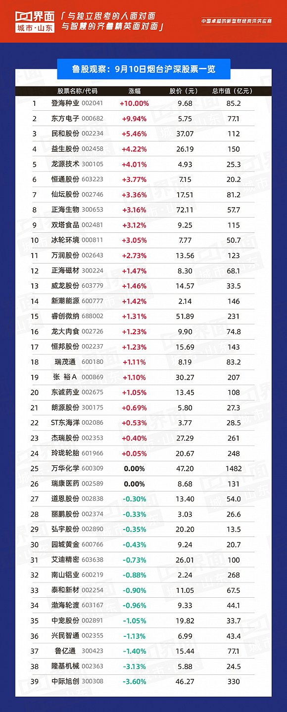 烟台市涨幅榜首:登海种业(002041),涨幅10.00%,股价9.68元,总市值85.2亿元;