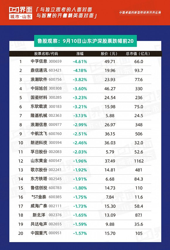 济南市跌幅榜首:中孚信息(300659),涨幅-4.61%,股价49.71元,总市值66.0亿元。