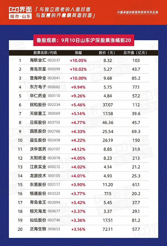 鲁股观察 | 9月10日119股上涨,海联金汇、青岛双星涨停