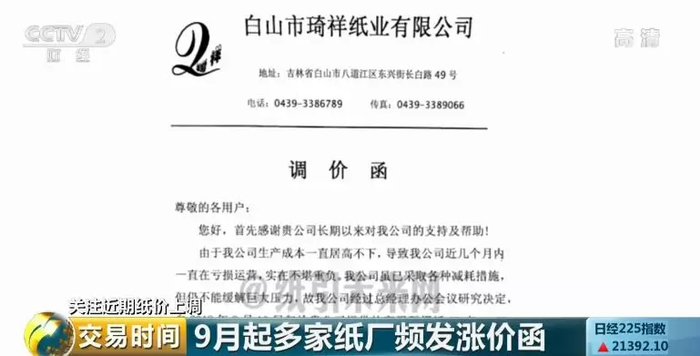 山东晨鸣纸业相关负责人徐中清:调价肯定是基于,一是涨价预期,因为国庆节结束之后,伴随着开学,一些课本印刷,下游需求上都需要纸张,他们的需求会进一步增加,我们这边涨价也是理所当然的;二是价格本来就存在于一种低位,再这么低下去的话,利润肯定也不行,下游的厂商也知道,而且我们的库存也偏低。