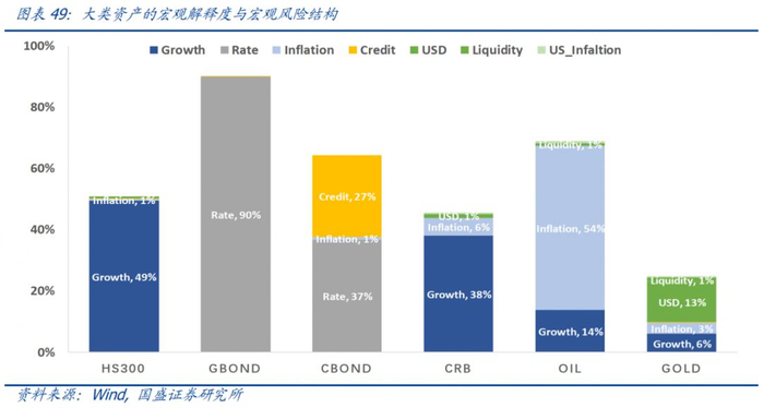 应用一:大类资产的宏观风险定价模型。我们构建了大类资产的宏观风险定价模型,从宏观风险的角度挖掘不同资产的核心驱动因素。对于大部分的资产而言,宏观风险定价模型能够解释50%以上的资产波动。