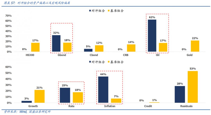基于《Asset allocation with risk factors》中提出的因子风险分解方法,我们将大类资产的波动分解到七个隐含因子和一个残差因子上。从结果来看,除了黄金之外,大部分资产被风险因子解释的比例基本上在50%以上,这也说明了我们的宏观风险定价模型均有较高的定价效率。