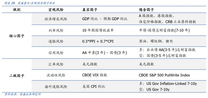 我们通过Factor Mimicking方法对国内的经济增长风险和通胀风险进行高频复制,配合已有的一些隐含因子,我们形成了国盛量化的宏观隐含因子体系: