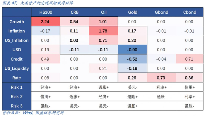 我们以回归方程得到的beta值作为大类资产对不同宏观风险的敏感性,从而得到大类资产的宏观风险载荷矩阵。基于宏观风险载荷矩阵,我们可以对大类资产的核心驱动因素有更加深入的理解。
