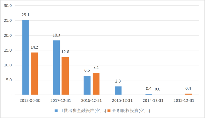 长期股权投资从2015年的0亿元增长至2018年上半年的14.2亿元,可供出售金融资产从2015年的2.8亿元增长至2018年上半年的25.1亿元。