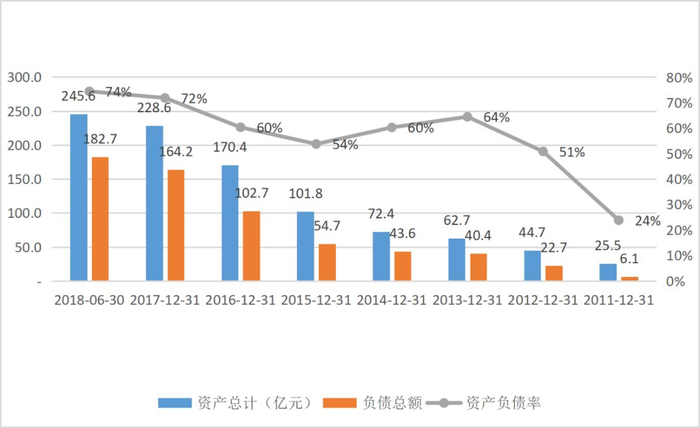 下图是雏鹰农牧2011年至2018年上半年资产、负债和资产负债率的变动情况,可以看到公司资产由2011年的25.5亿增长至2018年上半年的245.6亿,接近10倍;负债总额更是从6.1亿元增长至182.7亿,增长接近30倍,结果就是资产负债率由24%增长至74%。