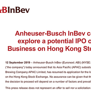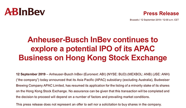 9月12日,百威英博(Anheuser-Busch InBev )在其官网发布公告称,百威英博亚太地区子公司(Budweiser Brewing Company APAC Limited,百威亚太控股有限公司,简称“百威亚太”,不包括澳大利亚业务)恢复将少部分股权在香港联交所上的市申请。