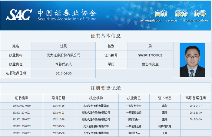 当事人过震曾于2012年4月23日在新时代证券注册了一般证券业务执业资格,并于2012年10月19日变更为保荐代表人执业资格,其注册变更记录显示,过震已于2017年4月30日从新时代证券离职。