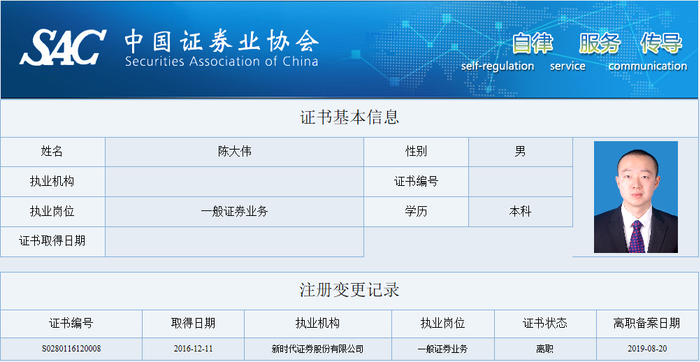 当事人陈大伟曾于2016年12月11日在新时代证券取得一般证券业务执业资格,现已于2019年8月20日离职。