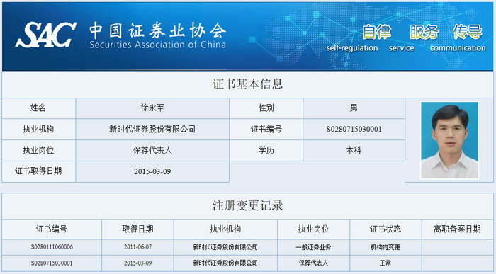当事人徐永军曾于2011年6月9日在新时代证券取得一般证券业务执业资格,并于2015年3月9日变更为保荐代表人执业资格。