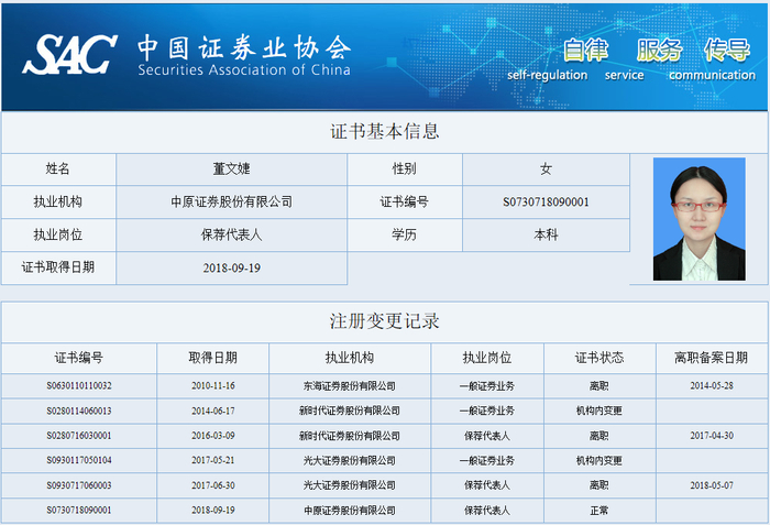 当事人董文婕曾于2014年6月17日在新时代证券注册了一般证券业务执业资格,并于2016年3月9日变更为保荐代表人执业资格。董文婕已于2017年4月30日从新时代证券离职。