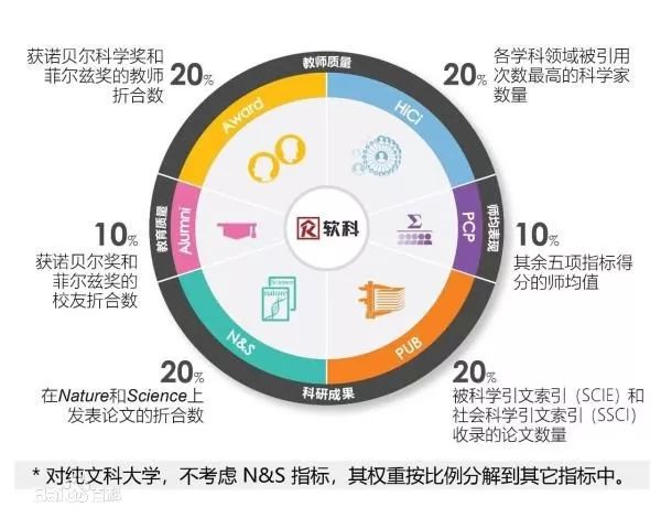 软科世界大学学术排名选择获诺贝尔奖和菲尔兹奖的校友折合数(简称Alumni)、获诺贝尔奖和菲尔兹奖的教师折合数(简称Award)、各学科领域被引用次数最高的科学家数(简称HiCi)、在《自然》(Nature)和《科学》(Science)上发表论文的折合数(简称N&S)、被科学引文索引(SCIE)和社会科学引文索引(SSCI)收录的论文数(简称PUB)、上述五项指标得分的师均值(简称PCP)等六个指标对世界大学的学术表现进行排名。
