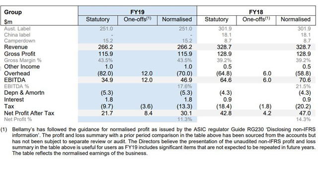 2018-2019年报显示,截至2019年6月30日,贝拉米收入为2.66亿澳元,同比下滑19%,中文标签奶粉销量为0,税后纯利为2179万澳元,同比去年同期的4280万澳元减少49%。