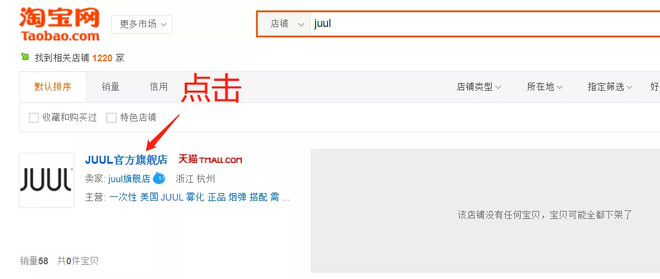 当前输入JUUL旗舰店后,出来的搜索页面如上,已经没有任何商品出售了,而点击店铺名字后,显示如下图,没有找到相应的店铺信息。