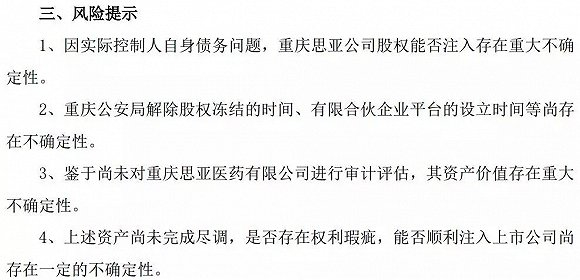 与很多中小股东的乐观相比,*ST华业则在披露公告的同时发布了四则风险提示,包括因实控人自身债务问题,重庆思亚股权能否注入存在重大不确定性;尚未对重庆思亚进行审计评估,其资产价值存在重大不确定性,等等。