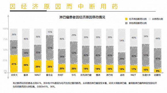 由于套淋、慢淋等患者需要长期服药,经济负担成了患者最大的问题。根据《白皮书》调研结果显示,2018年度,淋巴瘤患者年度医疗总支出平均值约为家庭年收入中位数的2.33倍,患者治疗总花费平均为32.6万元,治疗自费比例为60%。有61%的患者曾有过断药经历,其中19%是因为经济负担过重而断药。