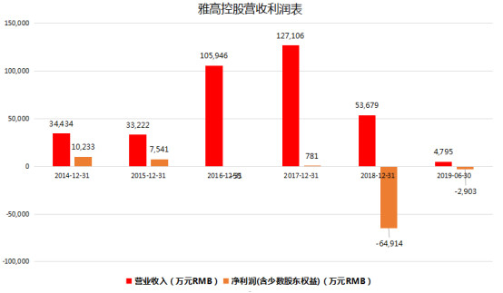 查看业绩,2018年雅高控股亏损高达3.96亿元人民币(单位下同),而17年同期的盈利是845万元。到了最新的2019年上半年业绩,雅高的营收为4795万元,同比下滑51%,净利润仍亏损2900万元。显然用持续亏损的经营业绩很难解释雅高的“股价”走势。
