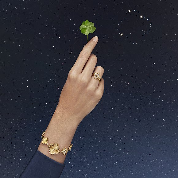 新款长项链由20枚幸运四叶图案串连而成,手链则由5枚四叶草点缀。梵克雅宝以玑镂雕花工艺打造了镜面抛光的黄K金,太阳放射饰纹在黄K金的表面映刻出了若隐若现的浮雕效果,钻石则与玑镂雕花黄K金相互交叠。光影之间,四叶幸运图案便能显现出温润又多变的光泽。