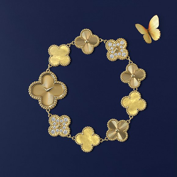 梵克雅宝对经典四叶图案的全新诠释之所以如此有趣,是因为玑镂雕花是一种十分罕见的工艺,只有技艺十分娴熟的工匠才能雕刻出精确而纯正的花纹。在1910年代时,梵克雅宝开始用镂雕工艺点缀腕表的表盘,1930年它又将镂雕延伸至珠宝盒、粉盒及Minaudières百宝匣的制作中。如今,梵克雅宝开始把这项工艺用于经典珠宝,将其独特的美学延伸到更多的作品里。
