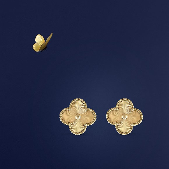 在Vintage Alhambra系列的3款新品中,玑镂雕花黄K金四叶幸运图案都由圆珠围拢装饰,与该系列的其它作品保持一致。在这一系列中,所有圆珠都由珠宝工匠精心润饰,再将磨圆的镶爪弯曲以承托四叶幸运图案,使作品拥有更为柔和的轮廓。