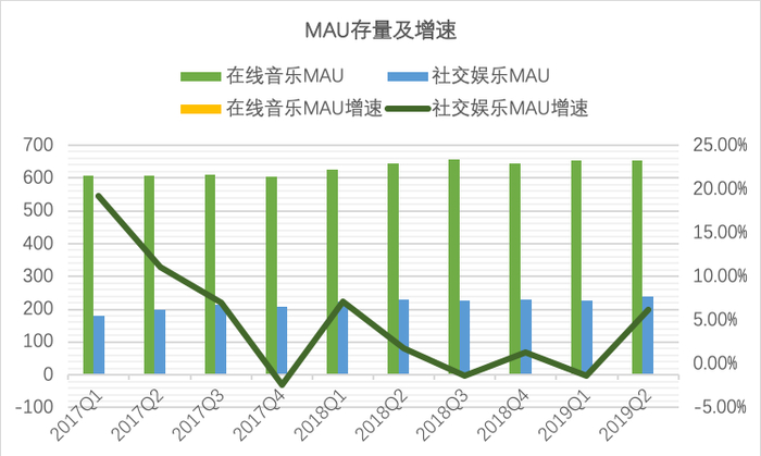 根据统计,2017-2019Q2,TME的在线音乐MAU(月活跃用户数)存量远高于社交娱乐MAU。然而在线音乐MAU的增速较低,2017-2019Q2期间仅增长4500万,累计增长率为7.41%;相比之下,社交娱乐服务MAU在期间内累计增长5900万,由于基数较低,累计增长率达到32.77%。