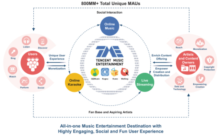 与Spotify专注音乐流媒体业务有所不同,腾讯音乐旨在构建一个庞大的音乐泛娱乐生态。目前,腾讯音乐旗下拥有QQ音乐、酷狗音乐、酷我音乐、全民K歌4个主流APP,业务从音乐流媒体延伸至在线K歌和音乐直播,此外还涵盖艺人经纪、音乐硬件销售等泛娱乐业务。