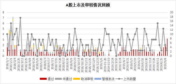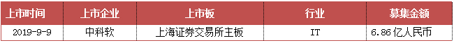 上周,共有1家内地企业上市,即2019年9月9日,中科软在上海证券交易所主板上市,发行价格16.18元/股,募集资金6.86亿元。