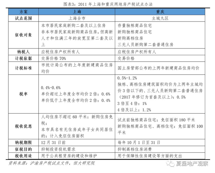 沪渝率先开展房产税改革试点。2011年,上海和重庆率先对个人住房征税,试点方案应该是未来全国推广房产税的重要参考方向。两市方案共同点是:(1)征税重点以新增购房为主,同时,买高价房就要交更多的税;(2)差别化税率,上海有两档,重庆有三档,控制高档住房的比例;(3)较为宽松的免税政策,减少对居民基本住房需求的侵害;(4)限制外来的投资需求,根据是否为本地居民采取不同征税条件。不同的是:(1)征税目标不同,上海主要是抑制投资,重庆主要是抑制高档住房消费;(2)实施范围不同,上海全市推行,重庆仅覆盖主城九区;(3)征税对象不同,上海针对增量住房,重庆针对高端住房。