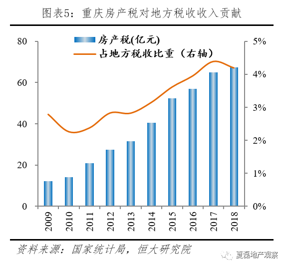 沪渝试点带来的税源有限,对房价影响不明显。从税收效果看,上海和重庆房产税并未获得可观的税收收入,2018年沪渝两市房产税收入分别为213.8亿元和67.3亿元,分别占各自地方税收的3.4%和4.2%,占各自土地出让收入的11.1%和3.2%。从市场效果看,房产税试点开始后,对比2011-2012年部分重点城市新建商品住宅价格指数,沪渝未出现独立走势。长期看,沪渝房产税试点对房价的影响不大,2011-2018年,上海和重庆的商品房均价平均涨幅分别为8.5%和8.6%。