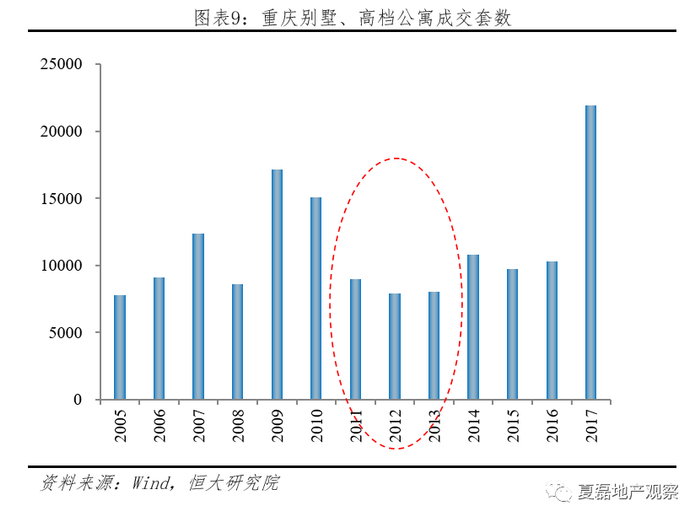 重庆房产税对高档住房消费产生了一定的抑制作用,但是存在开发商将高档住宅归为普通住宅的行列以规避房产税的可能性。从成交套数看,房产税试点后,2011年别墅、高档公寓成交套数较2010年下降约40%。从成交面积看,2011年政策出台后的五年,别墅、高档公寓平均销售面积为143万平方米,较政策出台前的前五年平均销售面积下跌了20%。