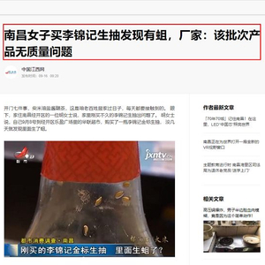 中国江西网报道,近日,一位家住南昌经开区的一位胡女士说,家里刚买不久的李锦记生抽出问题了。胡女士说,自己9月8号到经开区乐盈广场里的华联超市,购买了一瓶李锦记金标生抽, 没几天就发现里面生了蛆。