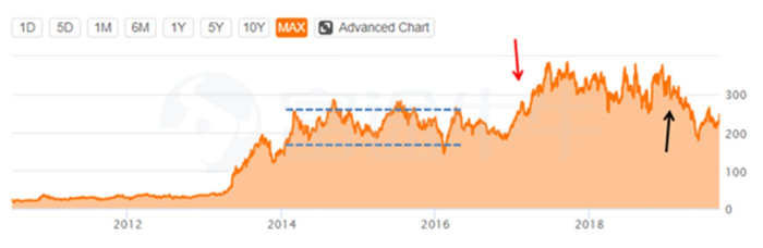 直到2018年底,特斯拉总算解决各种问题,按理说这才是Model 3释放潜力的起点,但进入19年股价却重新跌回150-260区间。为什么?