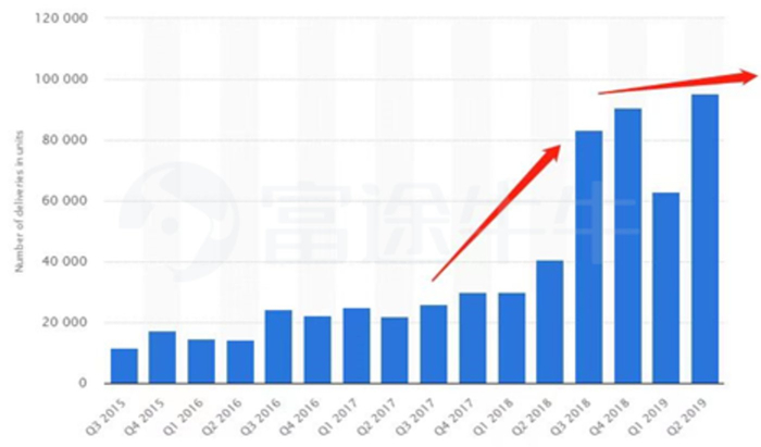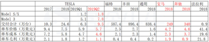2019年初,特斯拉进行了几次降价(黑色箭头,1月、2月分别全系降价2000和1100美元/辆),但交付量反而在一季度环比下滑。趋势上,2018年四个季度是Model 3产销快速爬升阶段,进入19年趋于平缓。价格不断下降,销量却没能继续高增长,意味需求已经被阶段性满足。