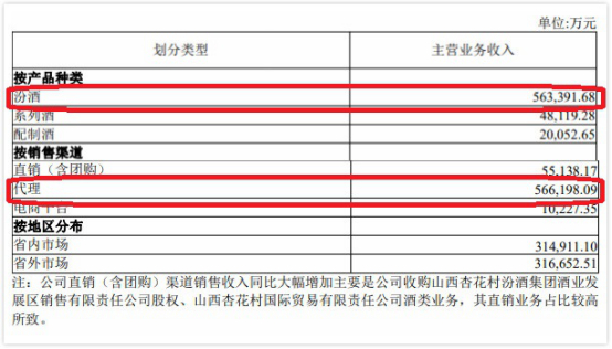 半年报显示,山西汾酒主要产品为汾酒,截至2019年上半年末,山西汾酒的汾酒产品实现营收56.34亿元;按销售渠道划分,代理为主要销售渠道,上半年实现营收56.62亿元,直销(含团购)上半年实现营收5.51亿元,报告称该渠道销售收入同比大幅增加主要是公司收购山西杏花村汾酒集团酒业发展区销售有限责任公司股权、山西杏花村国际贸易有限责任公司酒类业务,其直销业务占比较高所致。